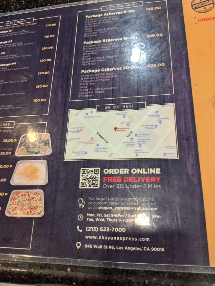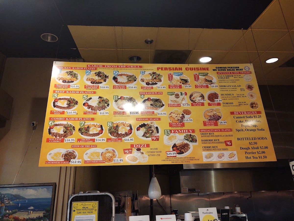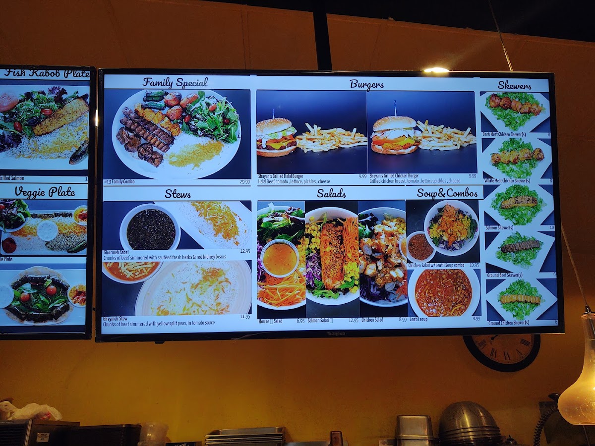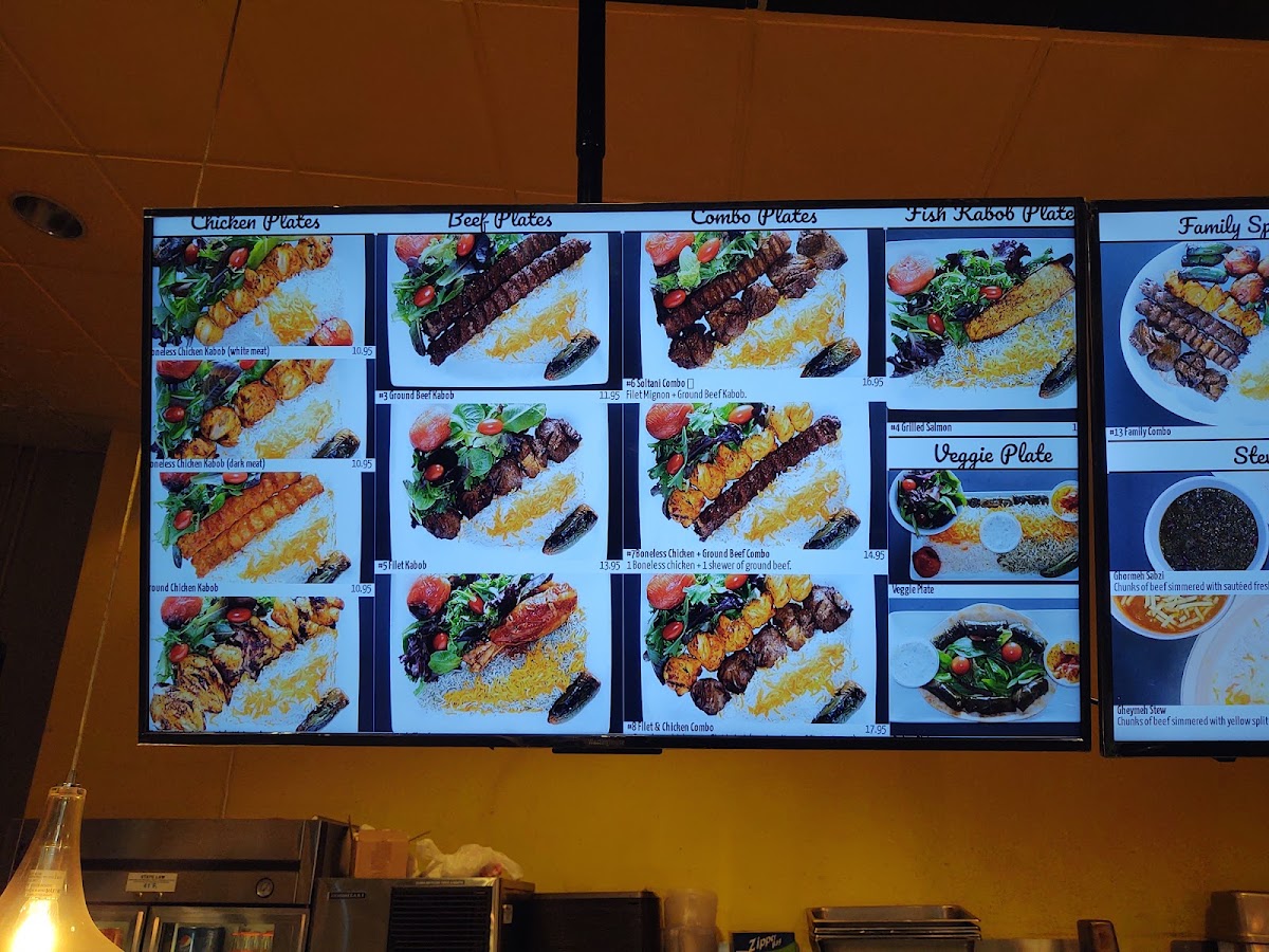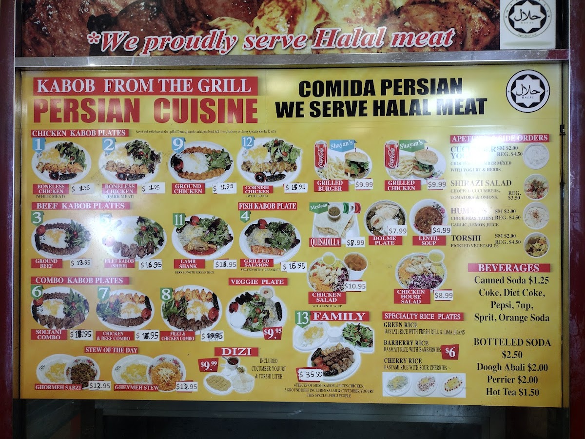 Serves three. Four pieces of Shish Kabob, four pieces of chicken kabob, two ground beef with salad and cucumber yogurt.